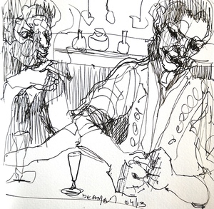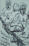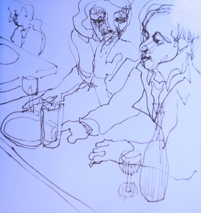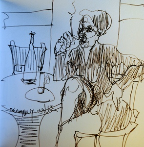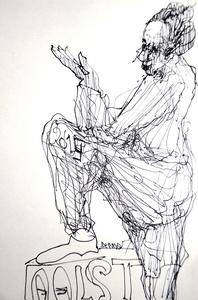 De menselijke figuur vatten in snelschetsen is omzeggens een dagelijkse bezigheid. Ik kan het niet laten mijn schetsboekje te hanteren als een soort dagboek. De schetsen weerspiegelen hopelijk nu en dan ook de ziel van de figuranten : wat hen beweegt ; hun drama ; hun zijn.